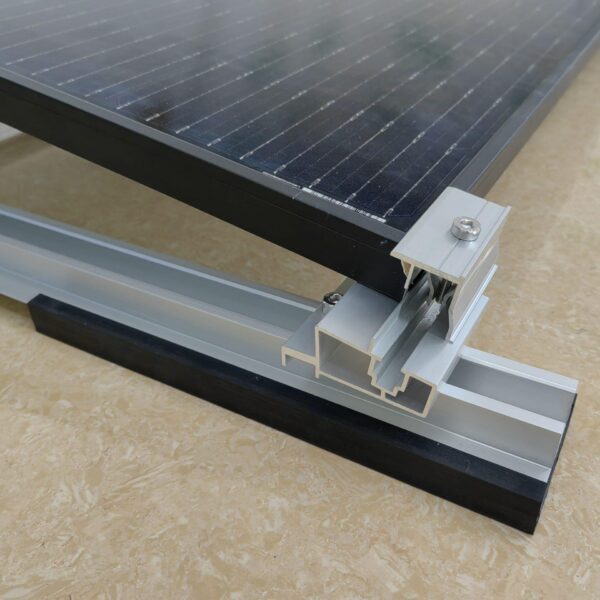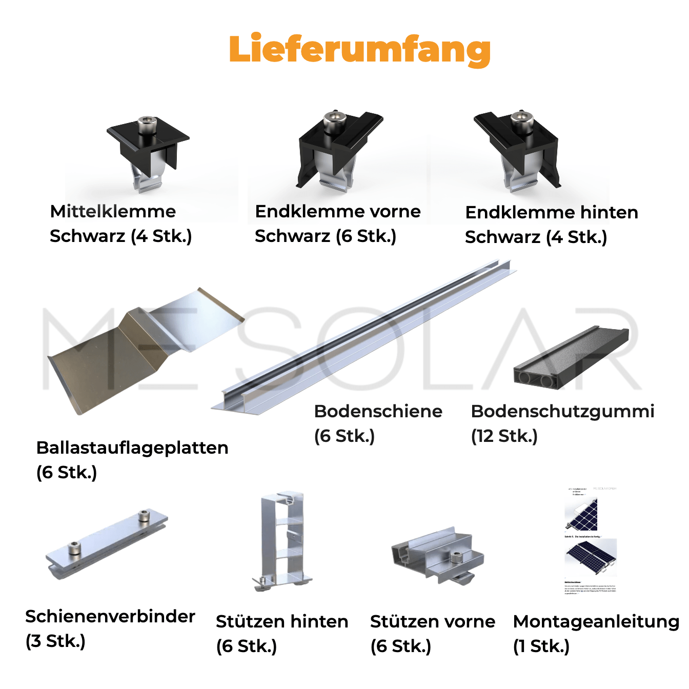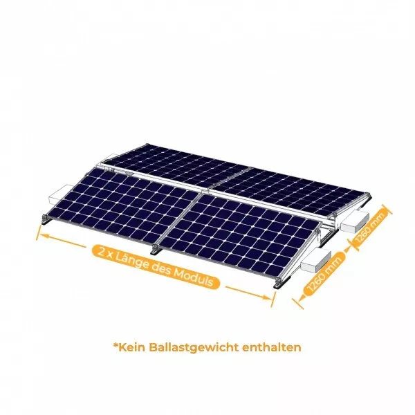 Der SolidFix Montage-Set für eine universelle Lösung für verschiedene Flachdächer. Die Befestigung erfolgt durch Ballast, somit ohne Durchdringung des Daches. Möglich ist der Aufbau von 4 Solarmodulen in Ost-West-Richtung oder Süd-Ausrichtung mit 10° Aufständerung.